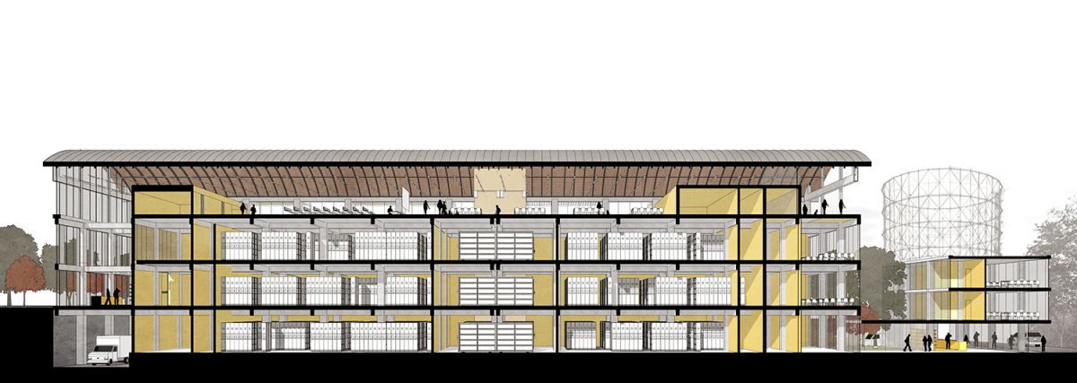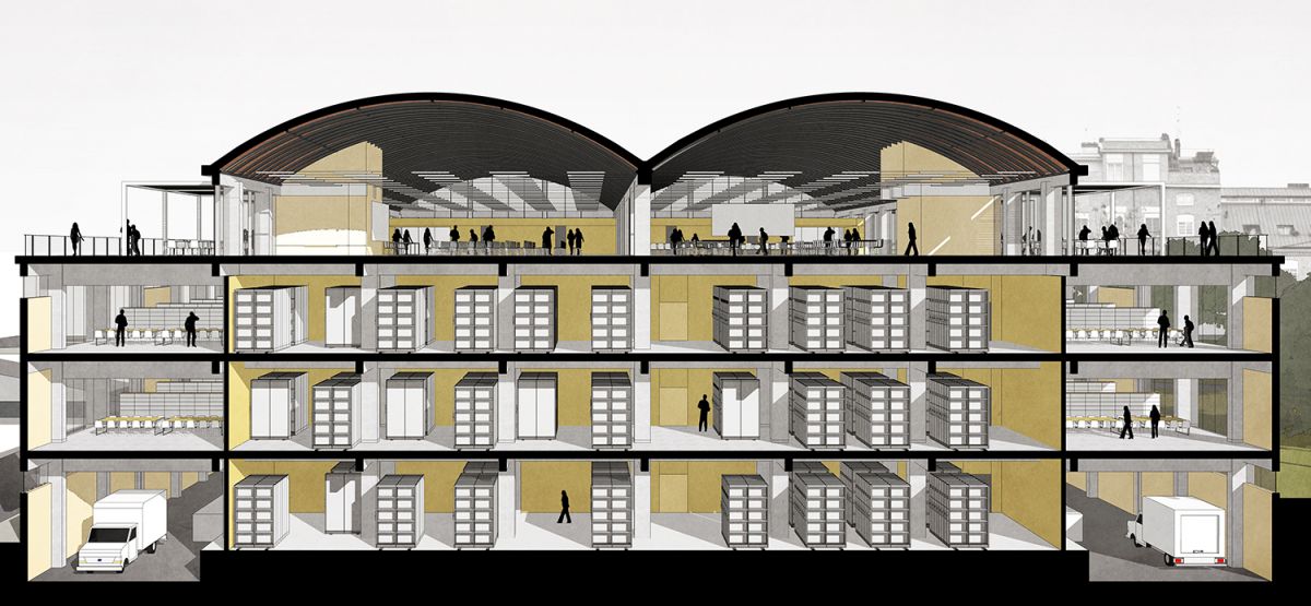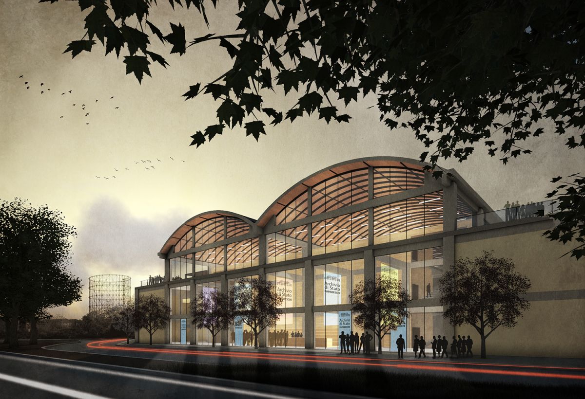 L’intervento riguarda la rifunzionalizzazione di un ex edificio militare tra via dei Papareschi e via Pacinotti. L’insediamento nell’area dell’ex Porto Fluviale di un così importante polo culturale come la nuova sede degli Archivi di Stato, potrà favorire la riqualificazione dell’intero quadrante. Il progetto di recupero integra le diverse tipologie di utilizzo: l’archivio, organizzato in una parte più interna, protetta dalla luce e dagli sbalzi climatici, e una zona più aperta, disposta a corona in prossimità delle pareti esterne, disponibile come zona di lavoro e di lettura. Il piano superiore, organizzato con pareti mobili che consentono di organizzare gli spazi in maniera flessibile, ospita l’area eventi, con sale conferenze e ristorazione, e la possibilità di accedere alle ampie terrazze panoramiche.