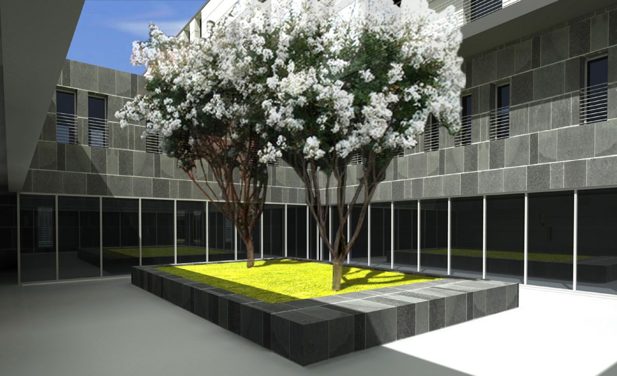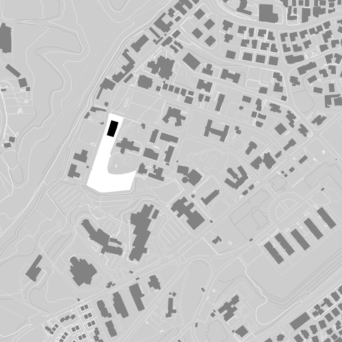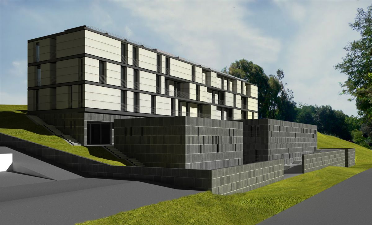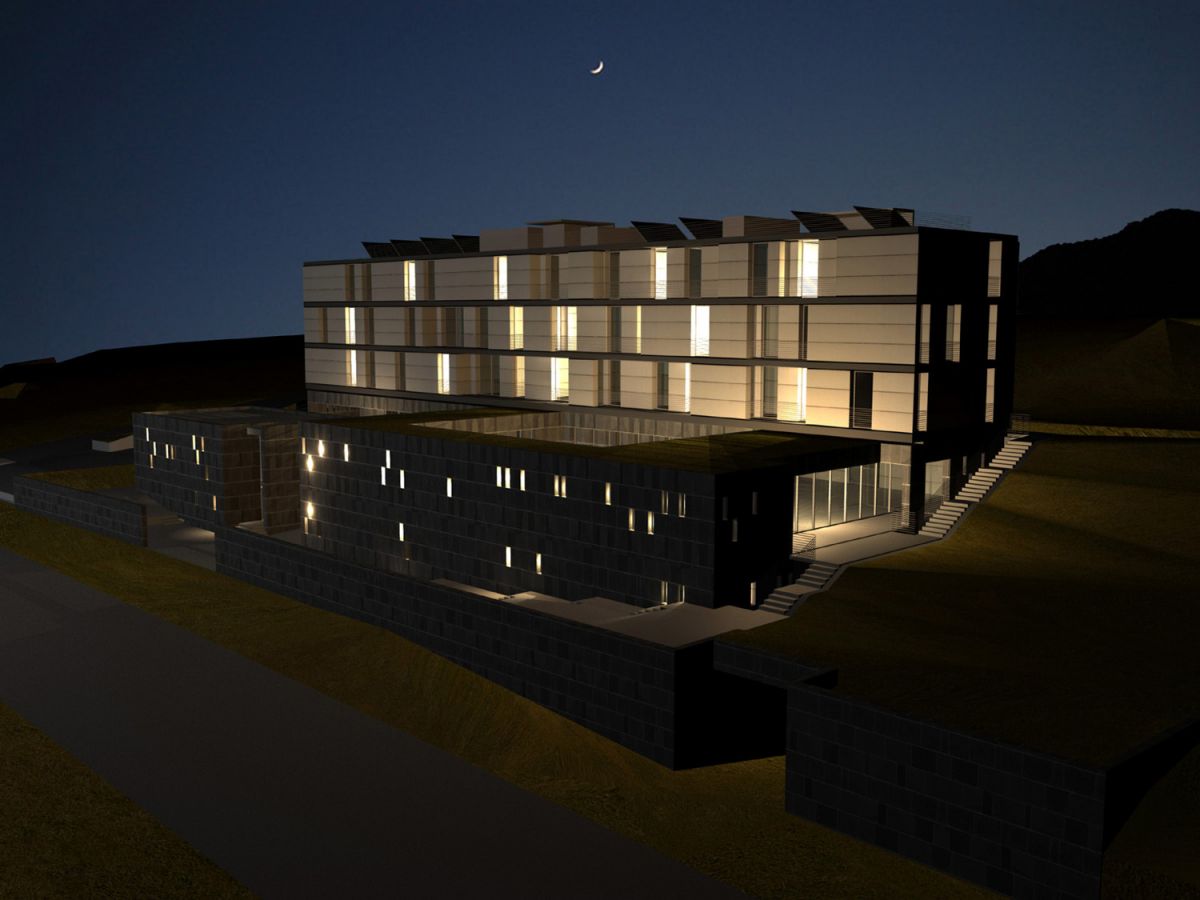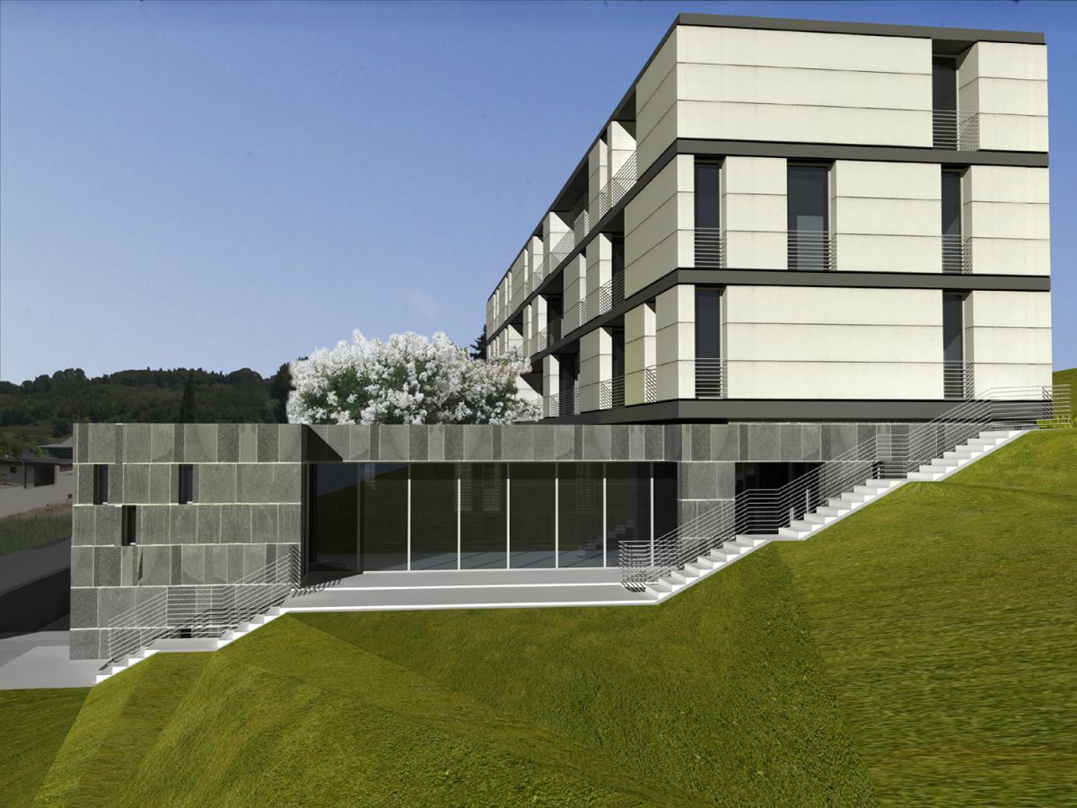 L’intervento considera le caratteristiche morfologiche del sito e pone l’edificio sul versante di un declivio, definendone una disposizione parzialmente interrata.