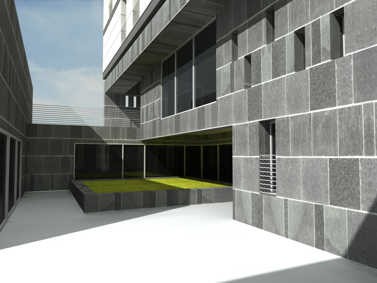 L’edifico si presenta con un fronte di cinque piani verso la strada e un fronte di tre piani sul lato opposto. L’edificio è caratterizzato da due elementi distinti: un volume basamentale sviluppato su tre livelli – di cui uno completamente interrato, e due inseriti interrati nella parte posteriore – e un corpo superiore sviluppato su tre piani con aperture rivolte verso l’esterno.