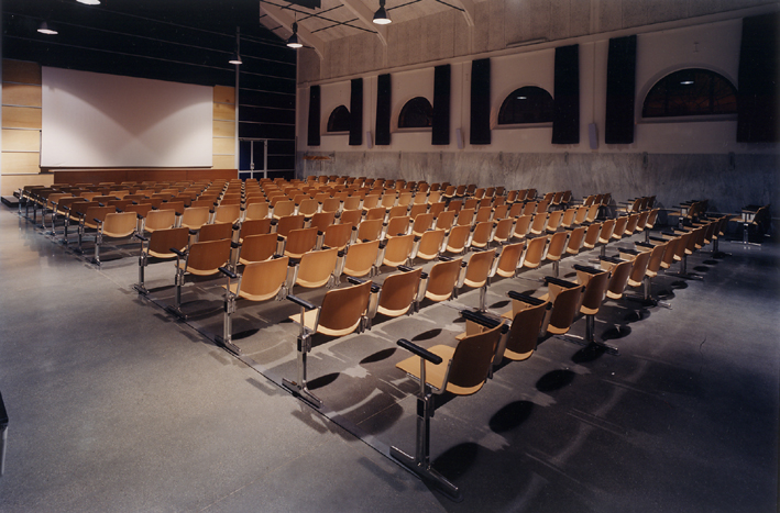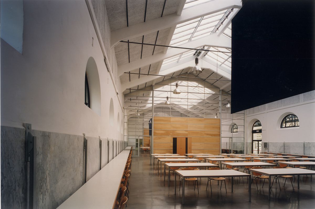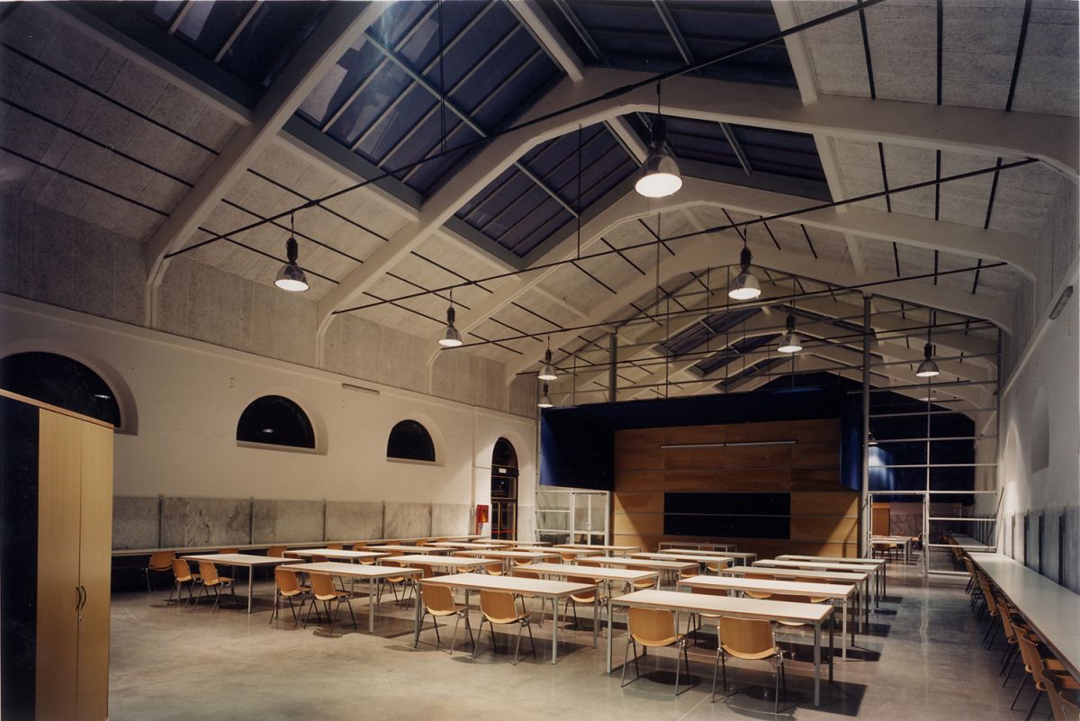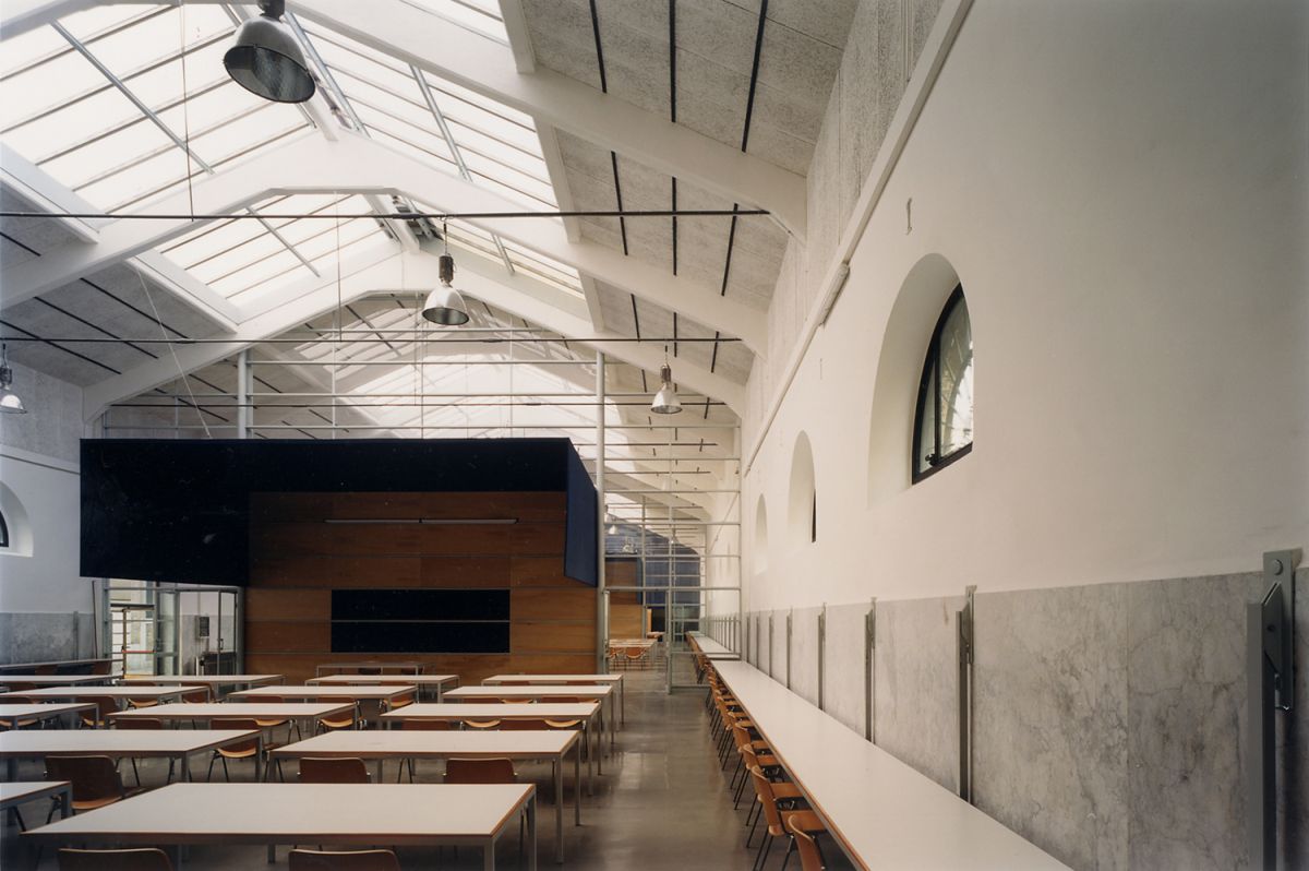Il progetto si sviluppa secondo un approccio che affianca il restauro e il risanamento conservativo all’incremento delle superfici interne, fino alla demolizione senza ricostruzione dei padiglioni esistenti. Il progetto ha riguardato il pad.6, con la realizzazione di servizi igienici e centrale termica, e il pad.7 che ospita un grande ambiente coperto illuminato da quattro grandi lucernari. Con la realizzazione di tre aule per laboratori e un’aula magna di 260 posti, si esalta il corpo industriale e si creano ambiti separati e isolati acusticamente, attraverso l’inserimento di tre pareti divisorie con struttura in acciaio. Questi si configurano come diaframmi trasversali parzialmente trasparenti e leggeri, realizzati con materiali (ferro, legno, vetro) e colori (bianco, grigio e blu) essenziali. I grandi velari geometrici e i lunghi tavoli pensili perimetrali ristabiliscono la scala umana e accentuano il volume dell’edificio, ribadendo l’uso universitario del luogo.