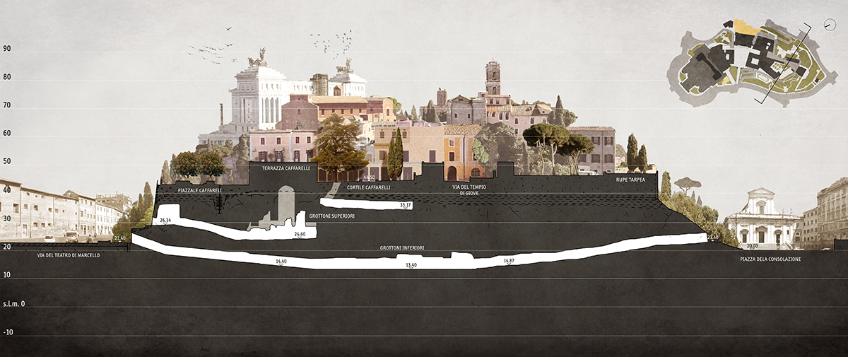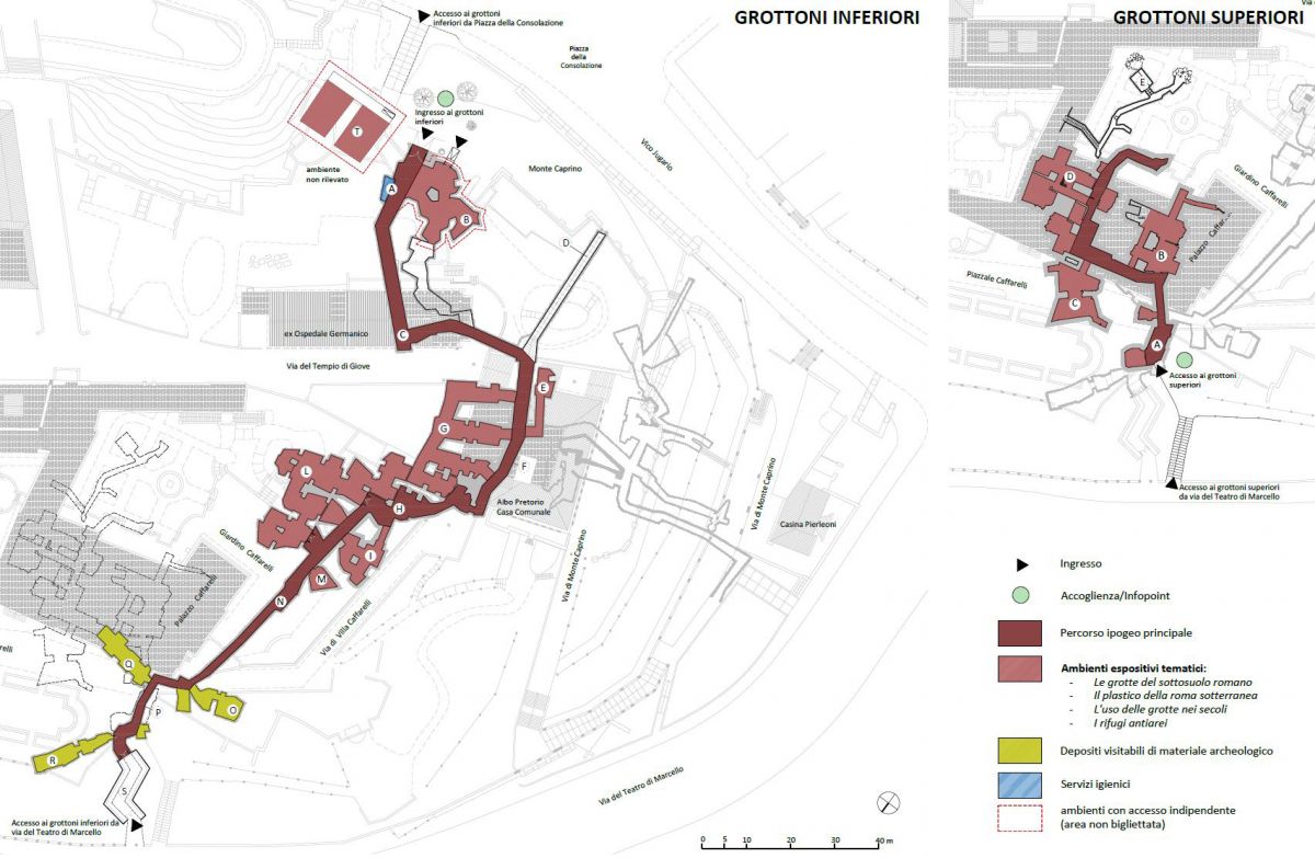 Il progetto dei Grottoni del Campidoglio, prevede interventi di restauro conservativo e di valorizzazione dei percorsi e delle cavità sotterranee che si snodano all’interno del colle attraversandolo in diverse direzioni e su più livelli. Le grotte sono state utilizzate nel corso dei secoli in vario modo, come magazzini, cantine, cisterne per la raccolta dell’acqua e come rifugi anti aerei durante la seconda guerra mondiale. L’eccezionalità delle condizioni di visita e di specificità del luogo, permette di promuovere forme di turismo alternativo, tra archeologia e speleologia, rendendo visitabili i depositi archeologici, con allestimento di Antiqurium e Lapidarium e raccontando attraverso istallazioni multimediali la natura delle cavità sotterranee di Roma.
