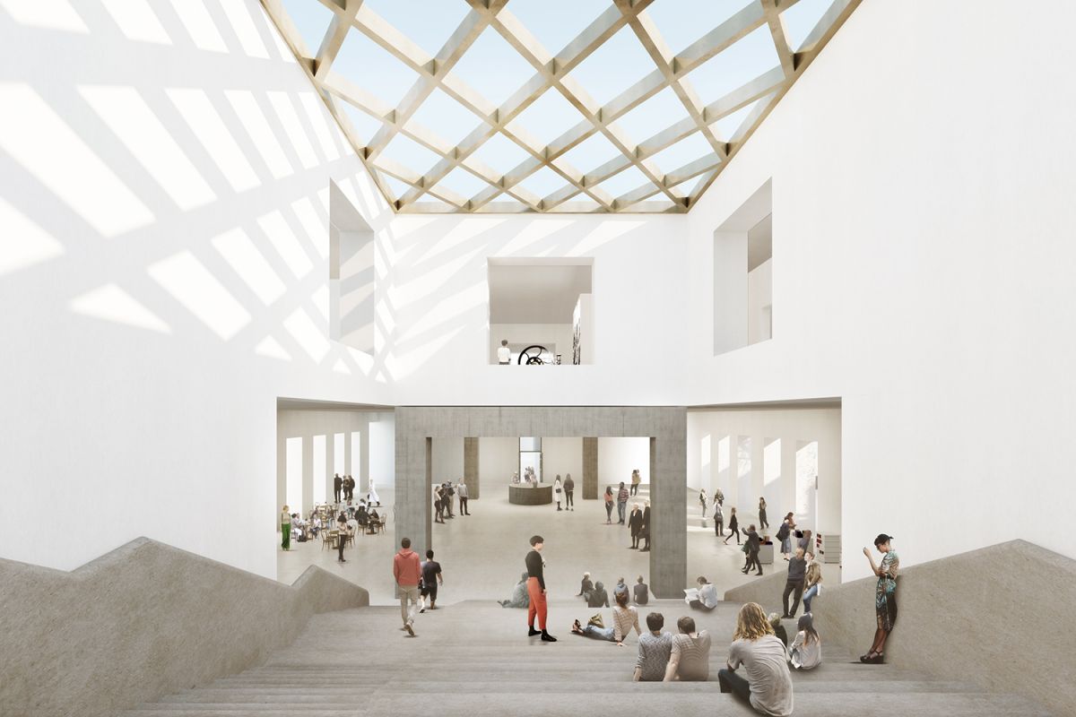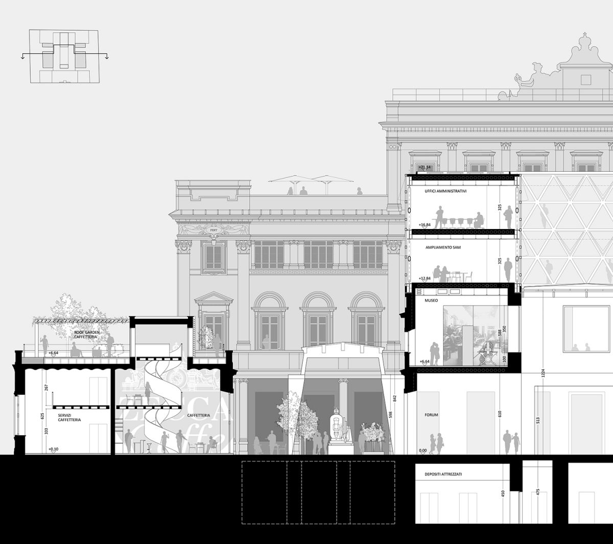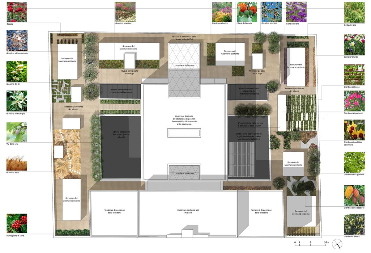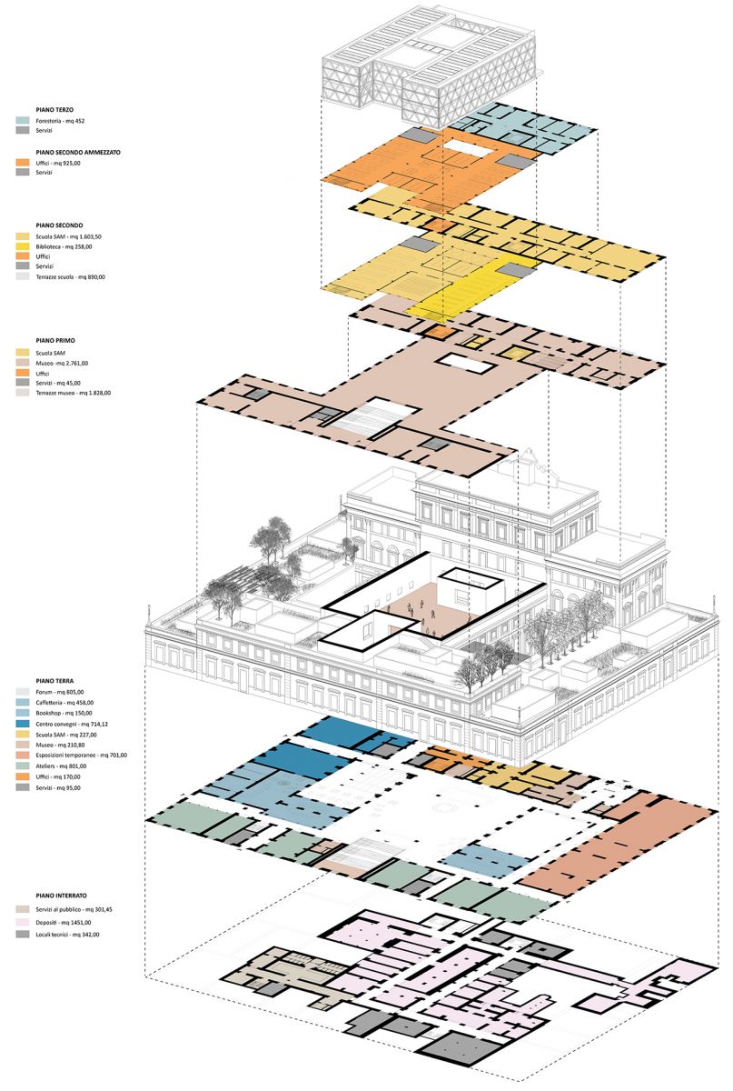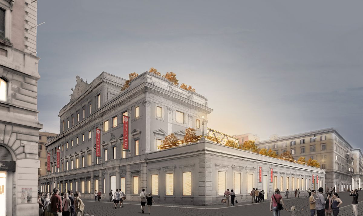 Il programma funzionale prevede la trasformazione dell’edificio della Zecca in un nuovo polo culturale urbano ricco di funzioni e aperto ai cittadini. I corridoi porticati dell’edificio si snodano intorno alla piazza centrale ed ai cortili, disegnando i diversi isolati; la nuova zecca diventa una sorta di piazza coperta e luogo di innumerevoli possibilità: come in una città nella città, sulla piazza si affacciano le attività a carattere urbano: la scuola, i negozi, il bar, la galleria delle esposizioni temporanee, il museo. La presenza della funzione eccezionale del Museo è segnalata dalla grande scala/tribuna che irrompe nello spazio della piazza coperta centrale e conduce al piano superiore. Ai piani superiori trovano ordinata collocazione la Scuola Filatelica, gli uffici e la foresteria. Il nuovo volume, astratto ed essenziale, indispensabile per dare forma razionale e compiuta al nuovo Polo Culturale, si posiziona tra i due cortili laterali, nel rispetto delle sagome preesistenti.