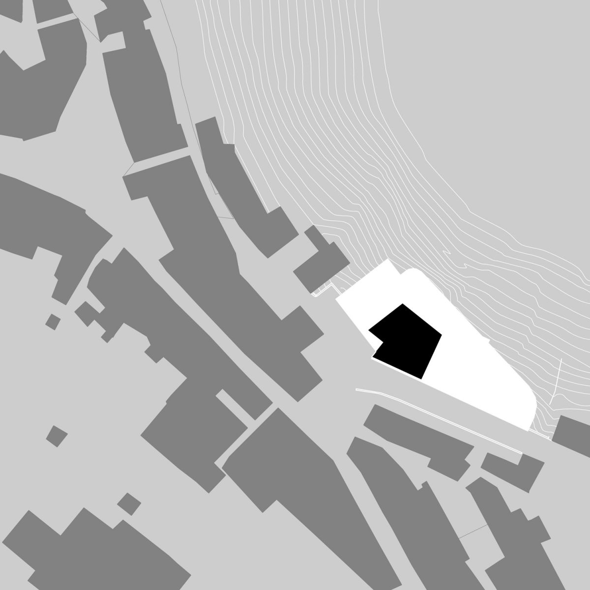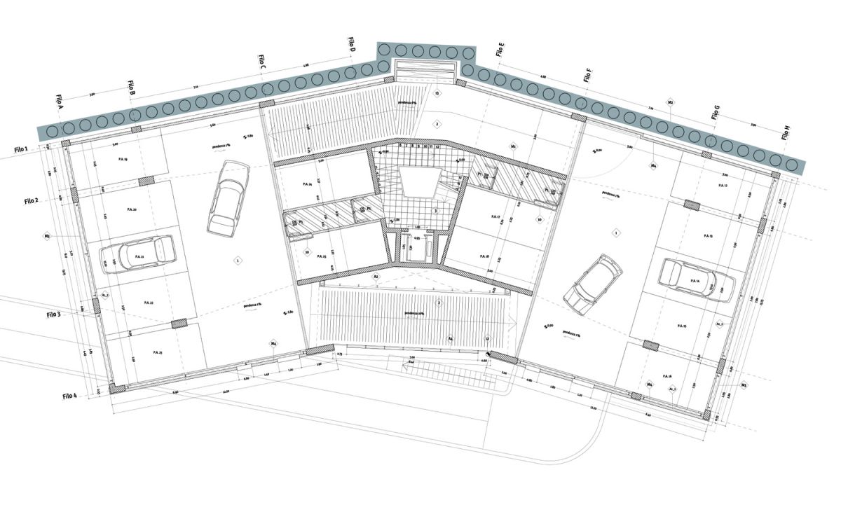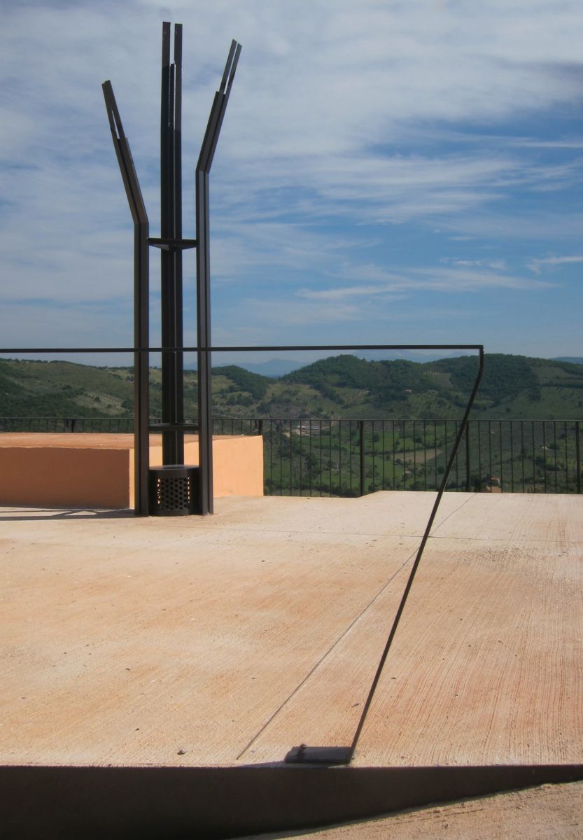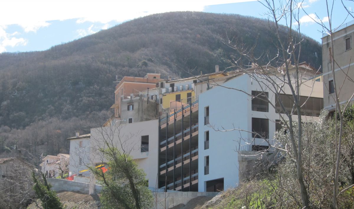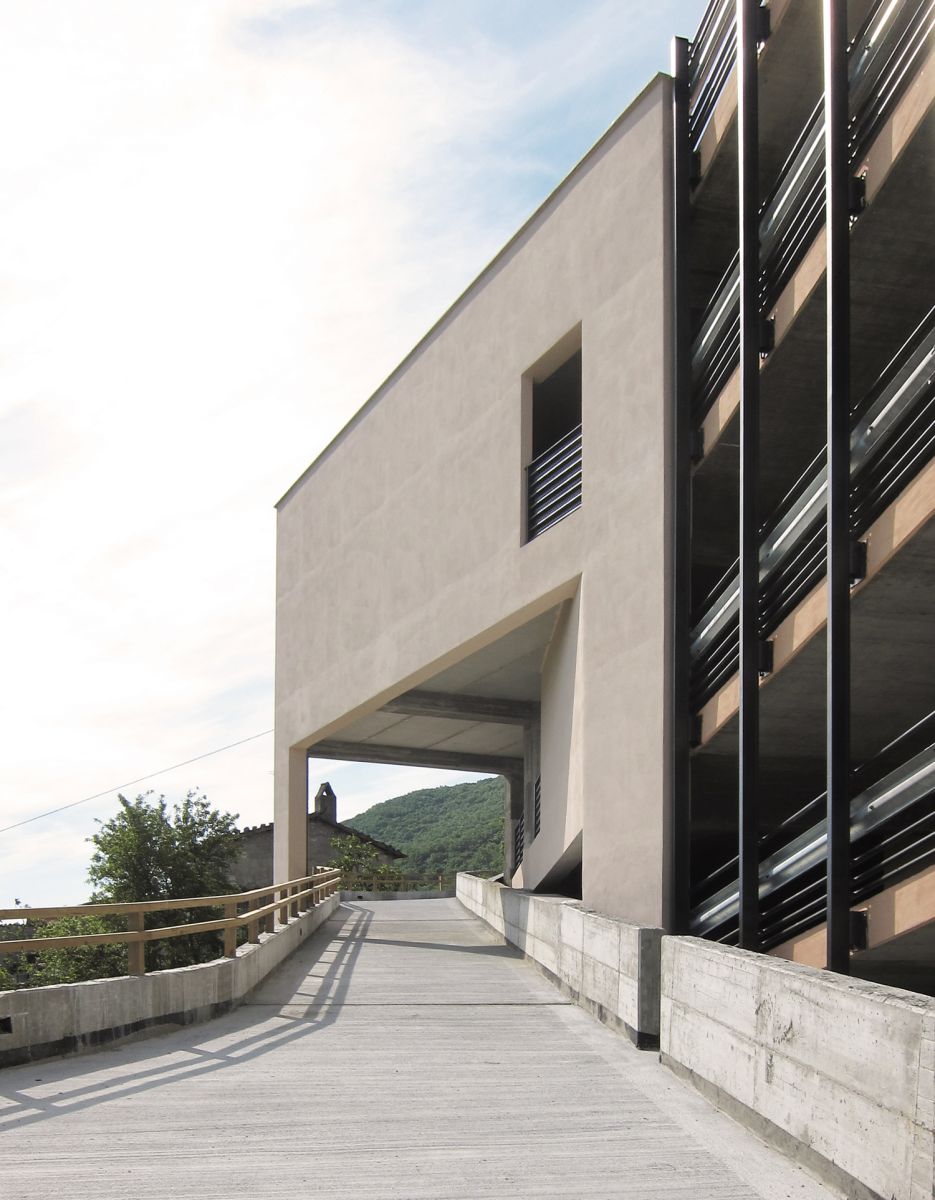 Obiettivo primario dell’intervento quello di realizzare un’opera attenta e misurata, che sappia contemperare le esigenze infrastrutturali di opere necessarie a garantire le condizioni di accessibilità al paese con le ragioni del paesaggio dei Monti Lucretili. Il progetto pone una grande attenzione alla volumetria dell’opera da realizzare, con la consapevolezza della estrema delicatezza dell’intervento. La scelta è stata quella di realizzare una sorta di bastione non emergente rispetto alle quote stradali, contenuto quanto possibile planimetricamente, che si inserisca nel contesto del prospetto di Scandriglia, fatto dei volumi delle case affacciate sulla valle. L’edificio è articolato in due corpi di fabbrica posti su piani sfalsati. Tale sfalsamento altimetrico consente il miglior raccordo fra le quote dell’edificio autorimessa e quelle della piazza e della strada esistenti. Il piano di copertura dell’autorimessa è complanare con la piazza Garibaldi e ne costituisce un ampliamento verso valle.
