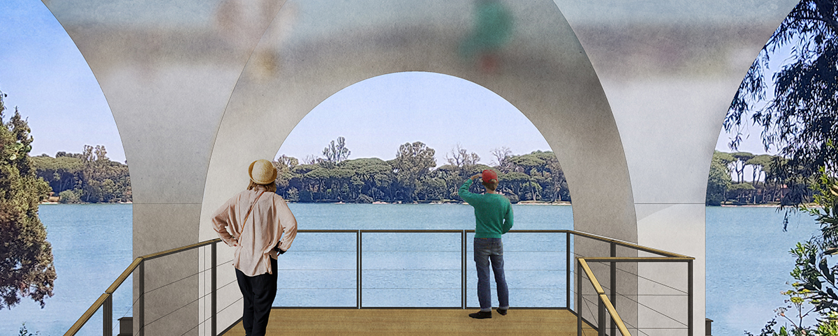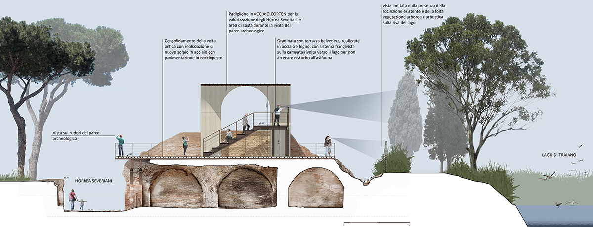 Operazioni di consolidamento strutturale delle volte e restauro dei paramenti, riguardano invece gli Horrea Severiani, gli antichi magazzini che affacciano sul bacino artificiale del lago di Traiano. Sulla testata degli Horrea il progetto ipotizza la realizzazione di un padiglione in acciaio corten che rievoca la spazialità degli ambienti voltati del secondo livello dei magazzini e diventa una occasione, raggiungendo la terrazza belvedere sopraelevata, di godere del panorama sul lago da una posizione privilegiata.