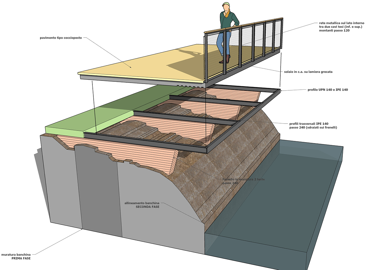 Il progetto di valorizzazione della Darsena consiste nella realizzazione di una passerella che rievoca il margine della banchina, che insieme alla rimozione calibrata della vegetazione e la bonifica delle sponde, favorisce la comprensione del sito archeologico.