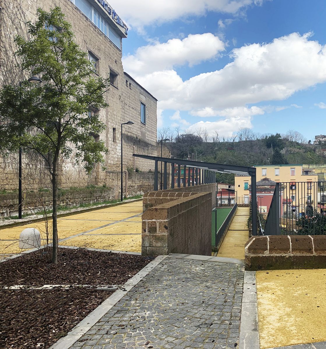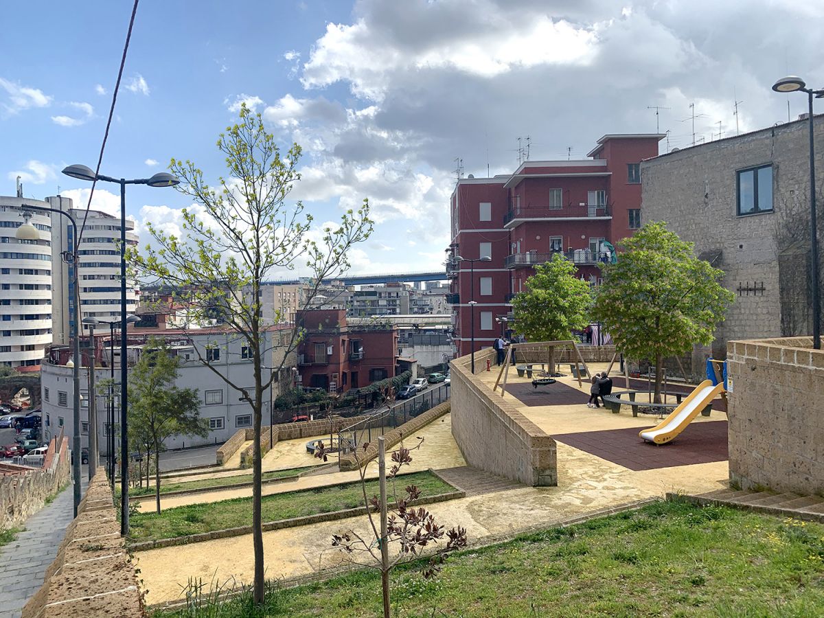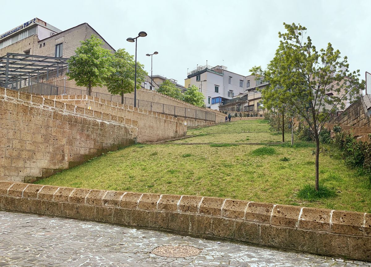 Il parco fa parte del progetto delle opere pubbliche del Piano di Recupero relativo all’ambito 20 Ponti Rossi. Sull’area retrostante il complesso residenziale già realizzato si apre un parco alberato di 2500 mq, arricchito da un giardino di quartiere di 650 m2. Il parco, che tramite l’antica scalinata si collega alla viabilità cittadina, è disposto su 5 terrazzamenti ed animato da sentieri, attrezzature, arredi per il tempo libero e aree attrezzate per i bambini. Le pavimentazioni sono realizzate con l’utilizzo di un calcestruzzo drenante per esterni altamente permeabile, resistente e facilmente manutenibile. I muri di sostegno che disegnano i terrazzamenti sono rivestiti in blocchi di tufo. Specie arbustive autoctone e piccoli alberi popolano i partere inerbiti sui pendii paralleli alla scalinata.