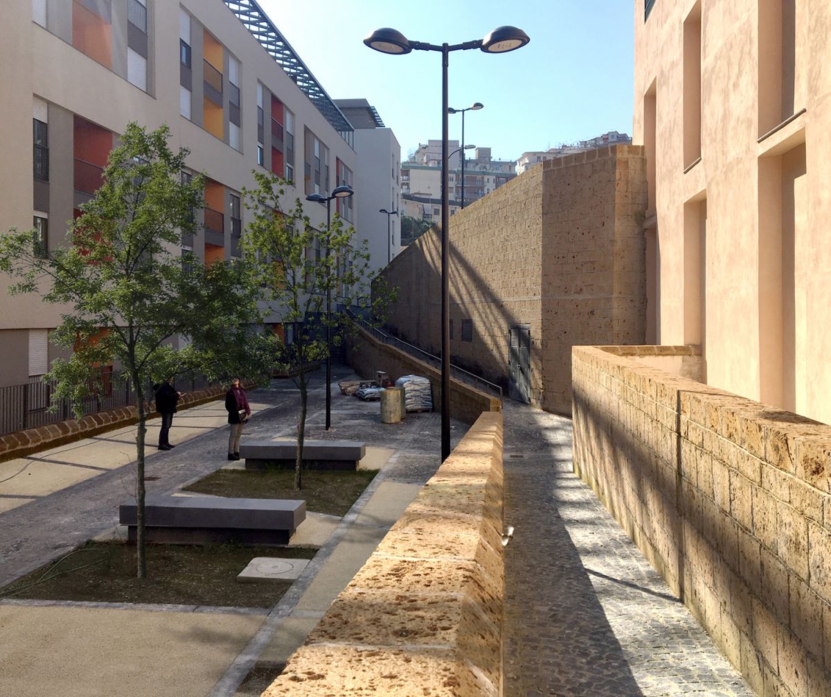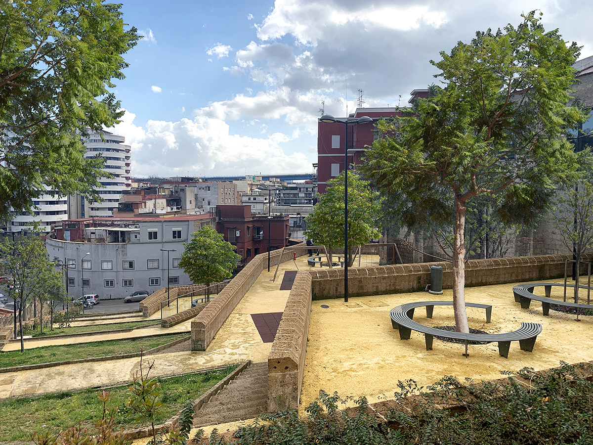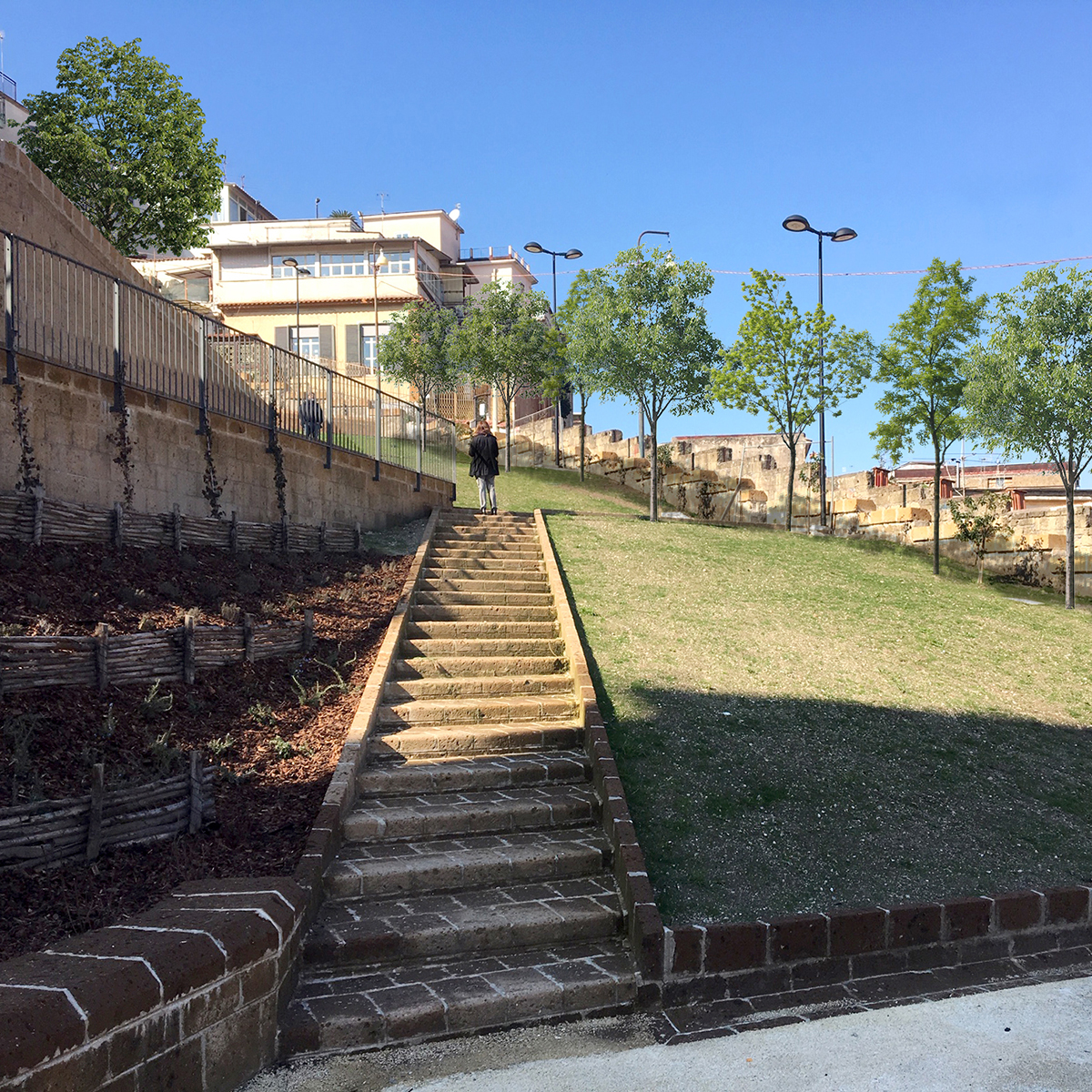 Il parco fa parte del progetto delle opere pubbliche del Piano di Recupero relativo all’ambito 20 Ponti Rossi. Sull’area retrostante il complesso residenziale già realizzato si apre un parco alberato di 2500 mq, arricchito da un giardino di quartiere di 650 m2. Il parco, che tramite l’antica scalinata si collega alla viabilità cittadina, è disposto su 5 terrazzamenti ed animato da sentieri, attrezzature, arredi per il tempo libero e aree attrezzate per i bambini. Le pavimentazioni sono realizzate con l’utilizzo di un calcestruzzo drenante per esterni altamente permeabile, resistente e facilmente manutenibile. I muri di sostegno che disegnano i terrazzamenti sono rivestiti in blocchi di tufo. Specie arbustive autoctone e piccoli alberi popolano i partere inerbiti sui pendii paralleli alla scalinata.