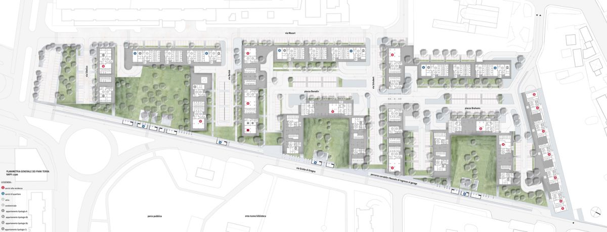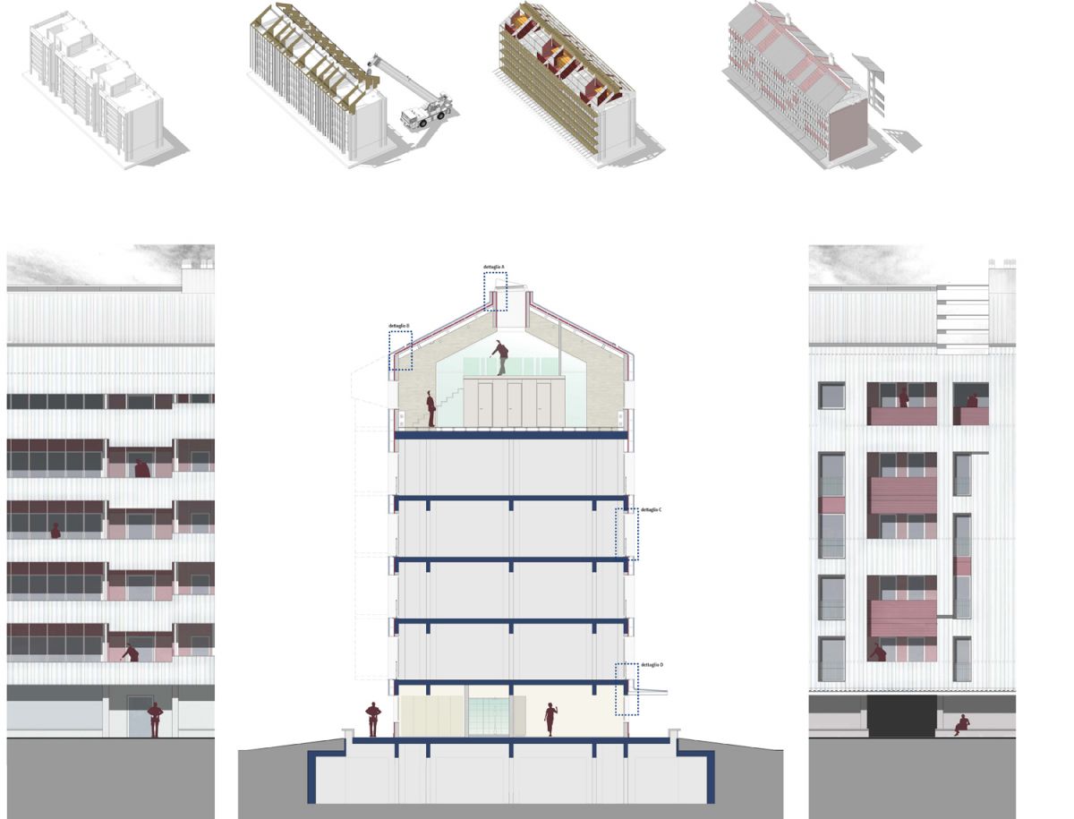 Il progetto colloca i nuovi alloggi in copertura, dotandoli di uno spazio aperto di pertinenza, mentre i servizi di vicinato al piano terra, sotto i porticati non utilizzati. L’intenzione è ottenere tipologie abitative innovative, con spazi di soggiorno vari ed articolati, capaci di servire le diverse esigenze degli abitanti, e di proporsi come elemento caratterizzante delle nuove case.