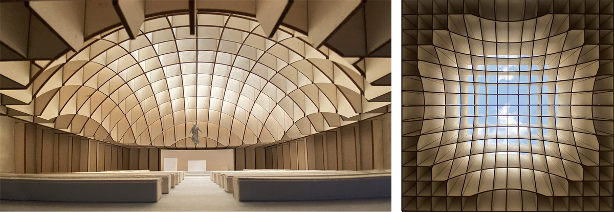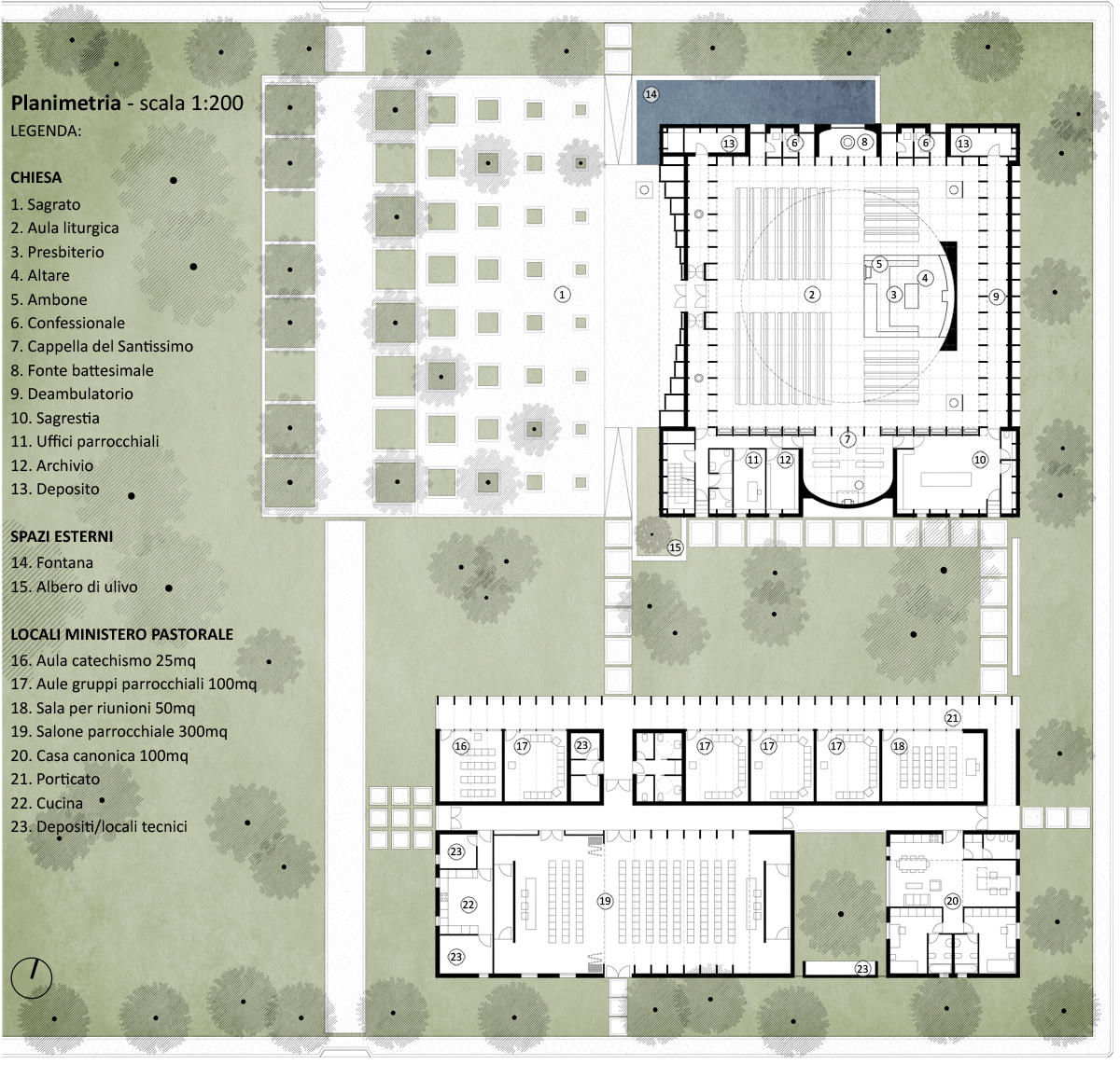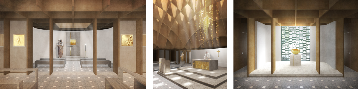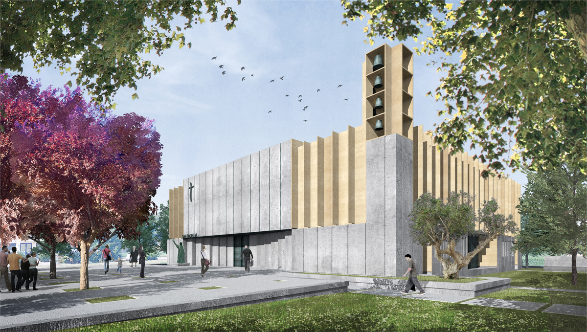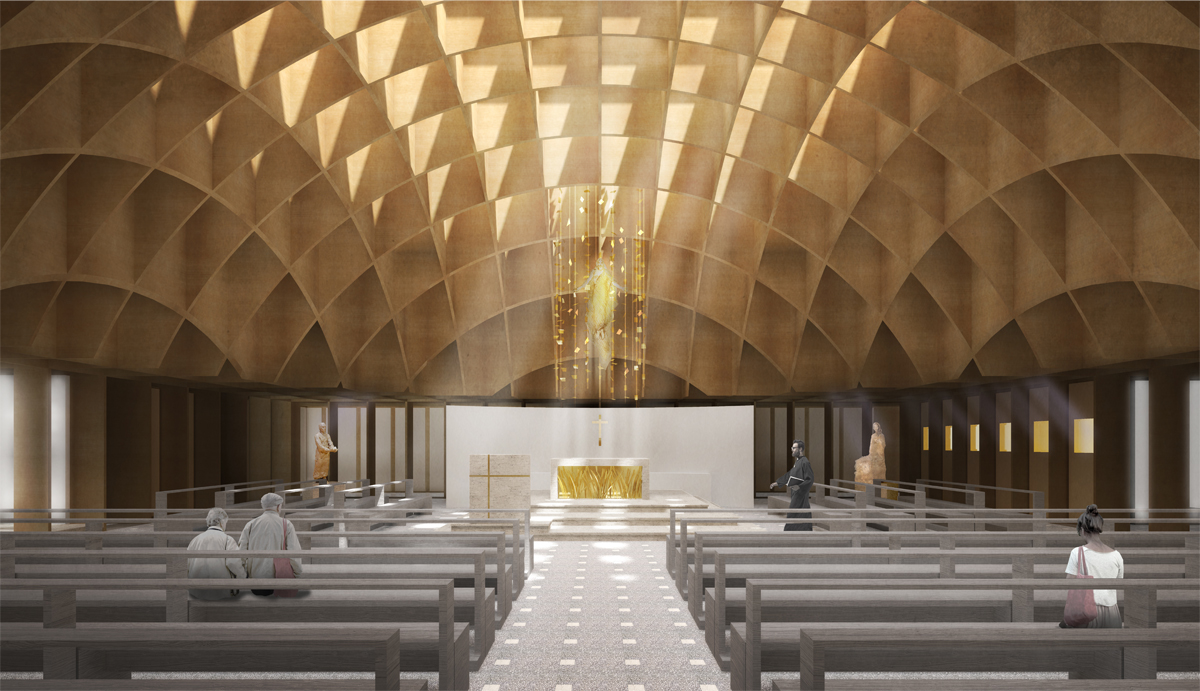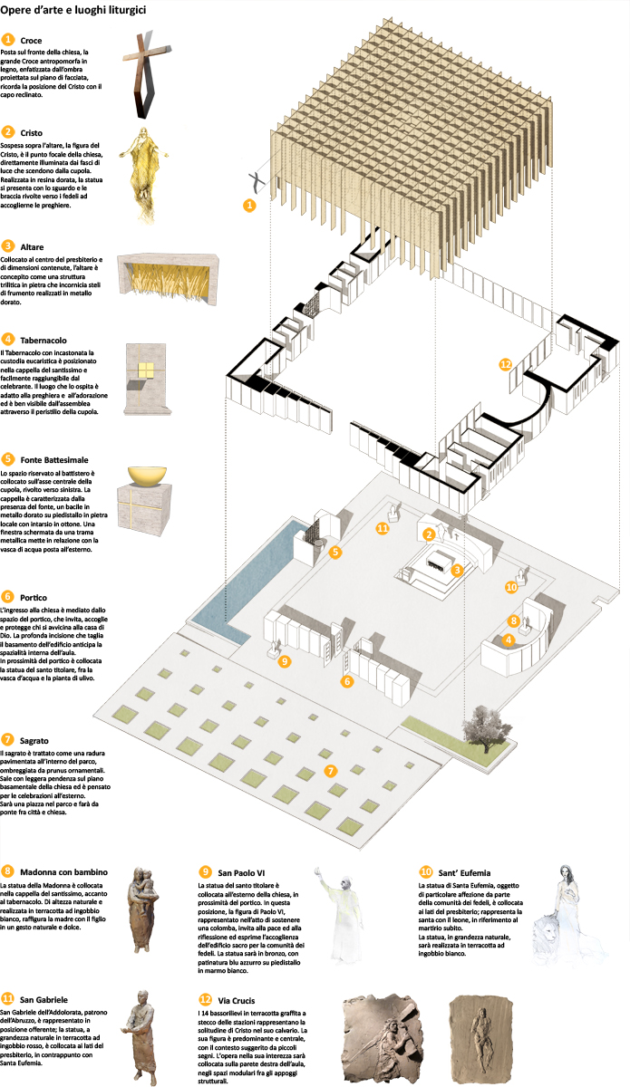 Nell’anonima confusione dei segnali urbani circostanti, il nuovo edificio esprime valori chiari e significanti, direttamente esposti sulla facciata, sul campanile, nel sagrato: la bellezza dei luoghi dedicati alla liturgia si propone come elemento di qualificazione dello scenario della vita quotidiana. Il complesso parrocchiale ha un carattere semplice ed essenziale. Ben visibile dalla strada principale, presenta la facciata ed il campanile sull’ampio sagrato alberato. È un edificio stereometrico, con un compatto volume a struttura lignea ritmato da nervature che scandiscono le parti murarie basamentali in pietra locale. La struttura dell’edificio si proietta sulle facciate esterne, che anticipano la meraviglia dello spazio interno, dominato dalla cavità della grande cupola centrale descritta dal cassettonato ligneo.