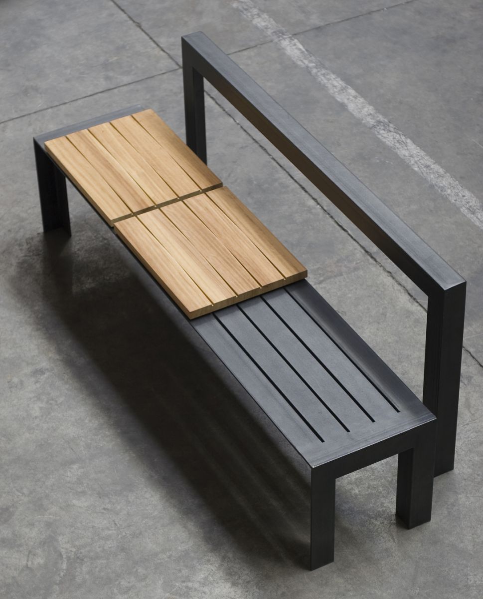 Panchina per esterni a quattro posti, in profili di alluminio saldati. La superficie della seduta è formata dalla combinazione di profili di alluminio a “T” e a “L” saldati alla struttura laterale lasciando una fessura di 8mm tra ogni profilo. Lo schienale, in profili di alluminio, ha una forma di “U” capovolta e rimane separato dall’elemento seduta.La panchina è galvanizzata e finita con polveri epossidiche.