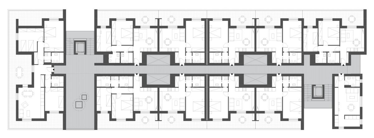Il corpo di fabbrica doppio, è servito da un ballatoio centrale aperto che corre lungo l’asse longitudinale; due corpi scala con ascensore assicurano la distribuzione verticale per 53 alloggi complessivi. La notevole lunghezza del complesso edilizio ha suggerito di articolare il volume in più parti al di sopra di un basamento unitario: le testate del blocco edilizio ruotano verso l’esterno, mentre i tagli dei corpi scala sezionano il volume del fabbricato.